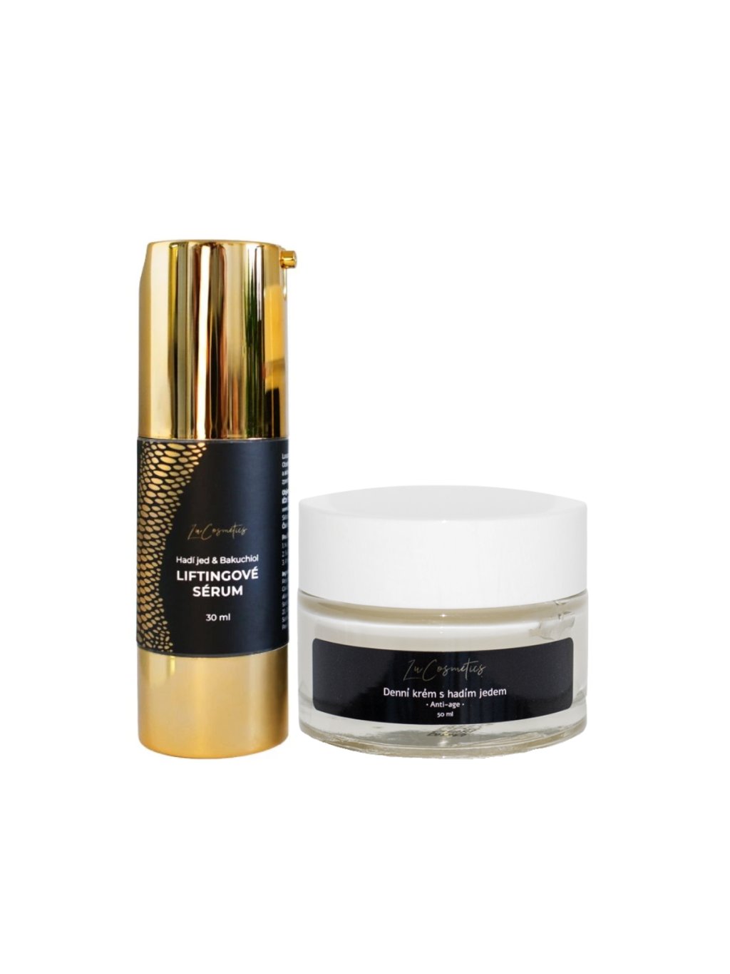 Vyskúšajte kompletnú anti-age starostlivosť s LuCosmetics, ktorá spája silu hadieho jedu a bakuchiolu pre maximálny lifting a regeneráciu pleti. Táto exkluzívna sada kombinuje liftingové sérum a krém, ktoré spoločne redukujú vrásky, zlepšujú pružnosť pokožky a dodávajú jej mladistvý jas a pevnosť. Ideálna pre každodennú starostlivosť, ktorá zanechá vašu pleť hladkú, hydratovanú a viditeľne revitalizovanú.